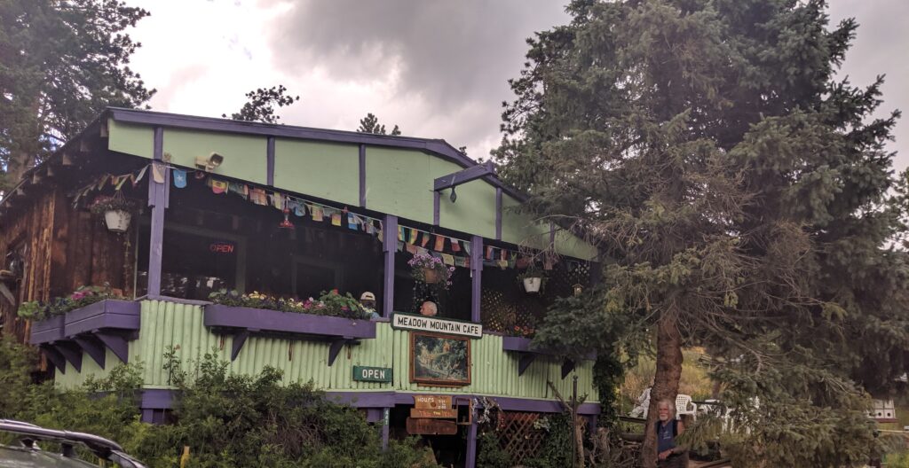 We may have been in the mountains, but the old sailor’s expression “any port in a storm” resonated with us—and this charming cabin was our port. Surrounded by the tall woods Meadow Mountain Café with its brightly painted lavender trim had a magical feel. A stepping stone path lined by wild flowers led to the entrance.